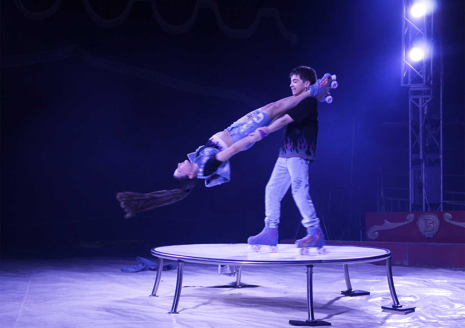 “Io scendo in pista con un numero in cui i nostri cani sono i protagonisti. Mia moglie Giusy si esibisce con gli hula hoop. Mio figlio Kevin, 22 anni, fa il giocoliere e ha ampi margini di miglioramento perché è giovane e ancora molti anni per provare e crescere artisticamente. I più piccoli della famiglia, Erminio (13 anni) e Luna (12 anni), si esibiscono ai pattini acrobatici. Hanno iniziato a studiare solo da un anno e miglioreranno tantissimo in questa disciplina. Non frequentano nessuna scuola di circo. Gli ho insegnato come iniziare e come esercitarsi. Nella preparazione seguono i miei insegnamenti”.